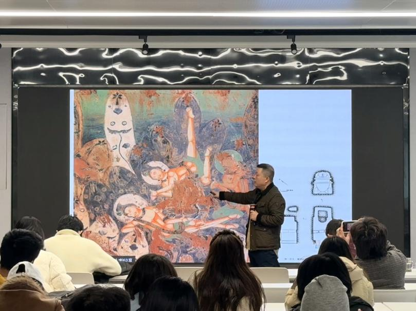 讲座中,刘韬教授系统梳理了丝路瑰宝龟兹石窟的艺术演变与研究脉络。龟兹石窟作为丝绸之路北道的重要文化遗产,现存800余座洞窟,集中呈现了中西文明的交融。讲座深入分析了艺术风格的流变:唐以前的本地“龟兹风”壁画,以“屈铁盘丝”画风和中心柱窟形制为特色;唐代汉传佛教艺术传入后形成的“唐风”,带来经变画等新题材;回鹘时期则呈现出多元融合的特点。刘韬教授通过克孜尔、库木吐拉等典型石窟,生动展现了龟兹石窟壁画在题材、形制与绘制技艺上的发展轨迹。